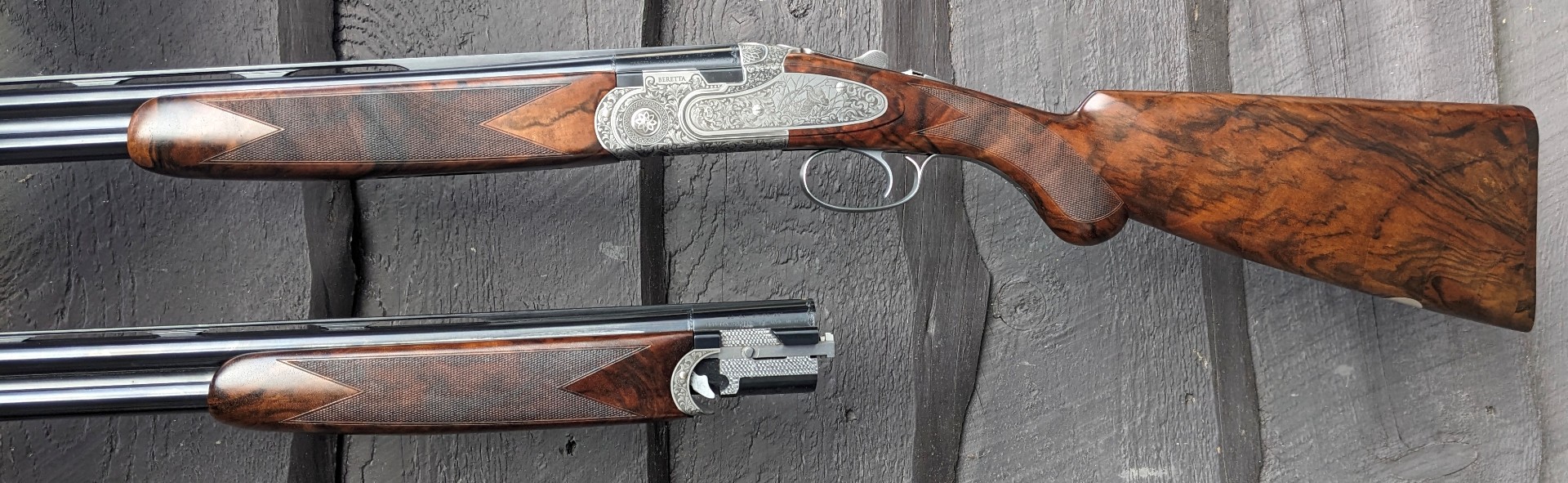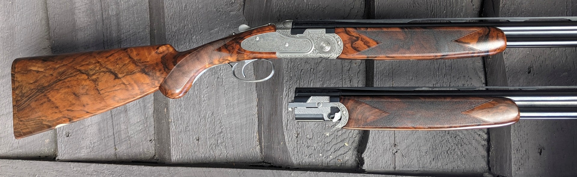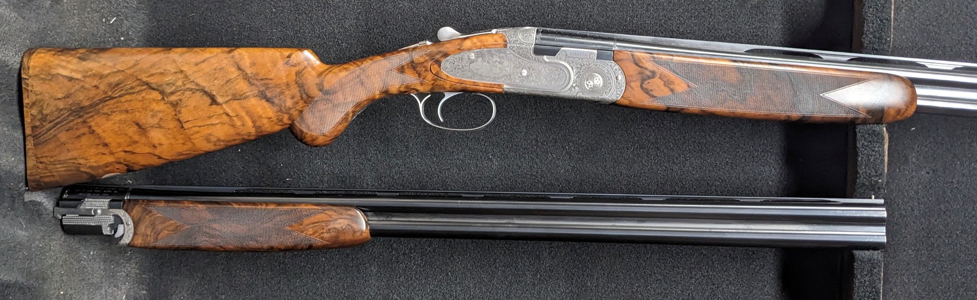 BERETTA 687 EELL FIELD CLASSIC 20 and 28 gauge combo, 28" barrels with Game Scene engraving. Made in Beretta's premium shop, it features side plates with hand-chased engraving, Prince of Wales grip, long fitted tang, and fine checkering. Dimensions are 1 7/16" X 2 5/16" with 14 5/8" LOP, weight is 6 lbs 4 oz. with the 20ga barrels on the gun. Comes in premium Beretta case with 5 flush optima HP chokes for both gauges.