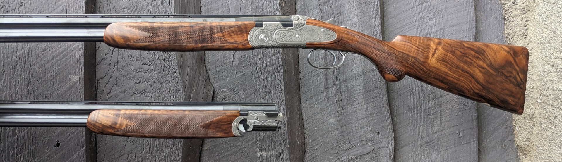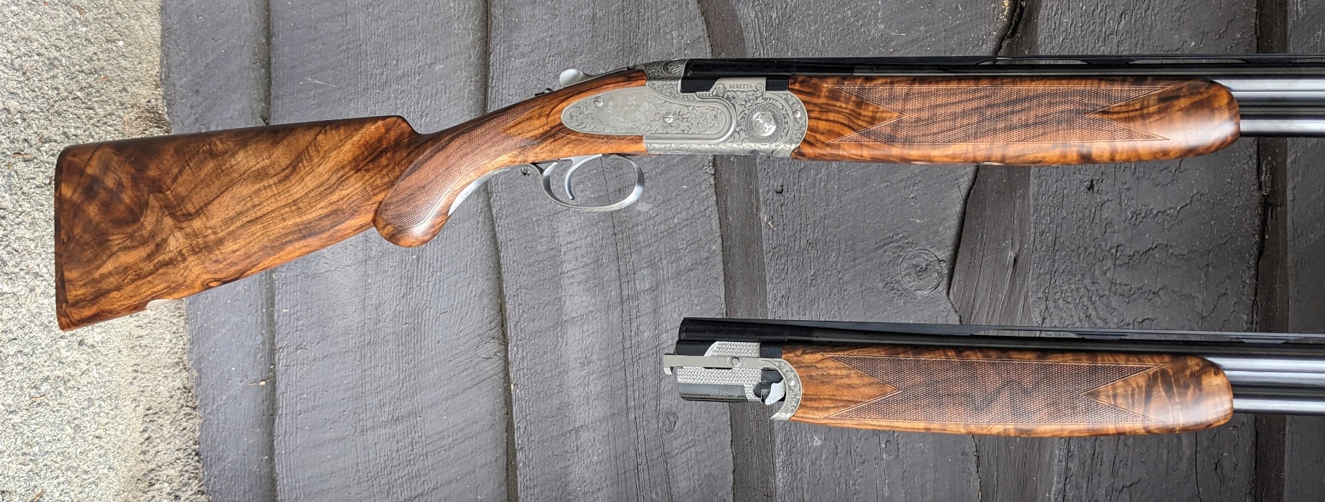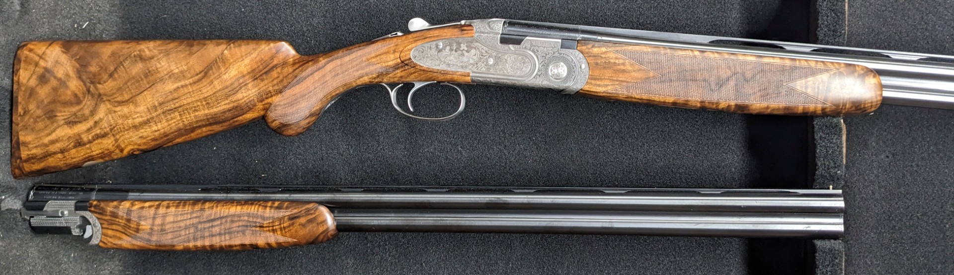 BERETTA 687 EELL FIELD CLASSIC 20 and 28 gauge combo, 28" barrels with Game Scene engraving. Made in Beretta's premium shop, it features side plates with hand-chased engraving, Prince of Wales grip, long fitted tang, and fine checkering. Dimensions are 1 1/4" X 2 3/8" with 14 5/8" LOP, weight is 6 lbs 5 oz. with the 20ga barrels on the gun. Comes in premium Beretta case with 5 flush optima HP chokes for both gauges.