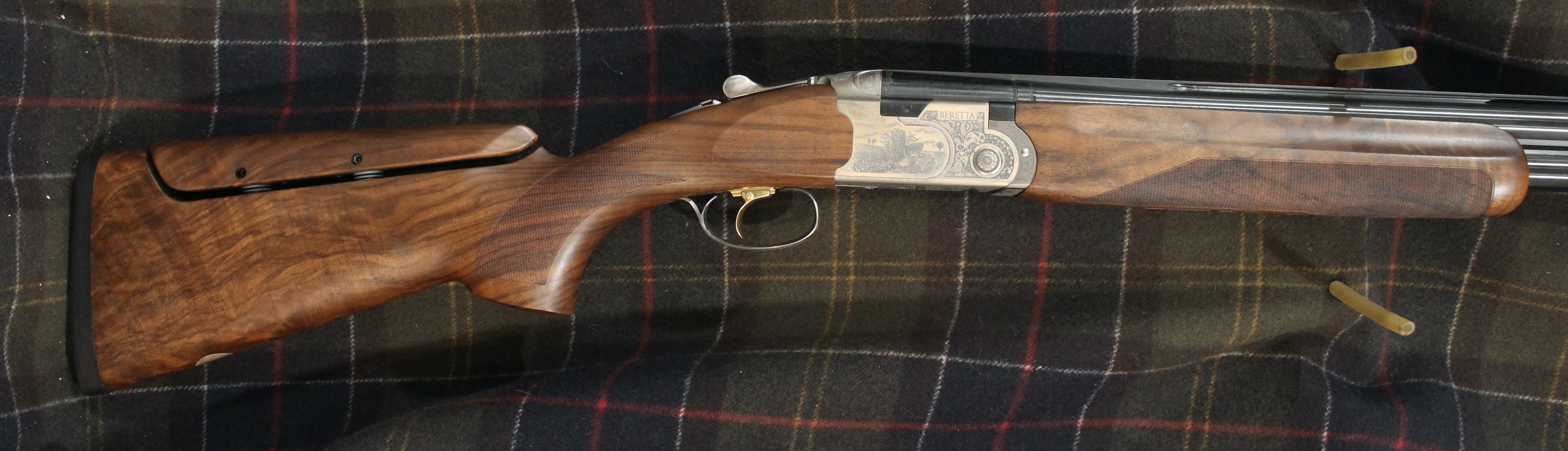 Beretta 687 Signature Deluxe Silver Pigeon III Sporting. Comes with our new logo and engraving on the SP3 receiver, Optima HP sporting barrels, beavertail forearm, upgraded EELL wood with B-Fast Adjustable Comb on a traditional drop away, sporting, style stock. Approximate drop dimensions of 1 5/8" and 2 3/8". Features 3 position trigger, and palm swell. Includes 5 extended Optima HP chokes, and combination lock case.