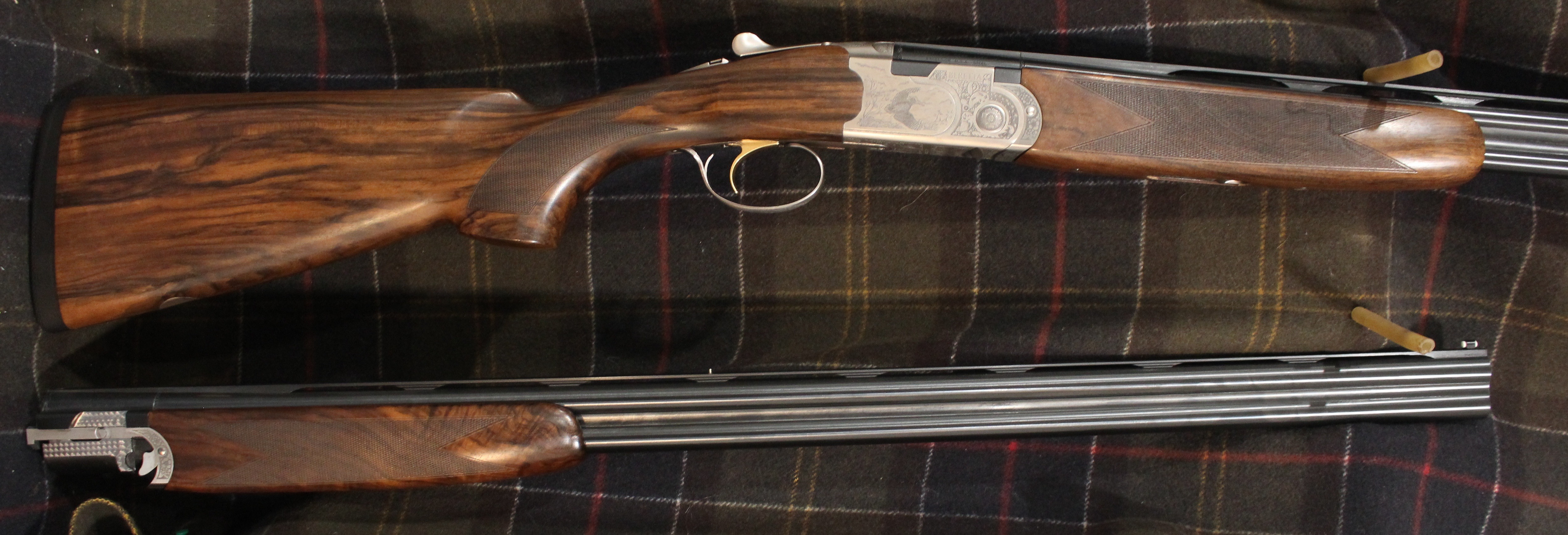Silver Pigeon 3 Signature Deluxe Sporting Combo - 28 & 410 gauge with 30" barrels, Deluxe engraving, manual safety, upgraded EELL wood, comes in Beretta case with 5 flush Optima HP choke tubes for the 28ga and 5 flush Mobil chokes for the 410.