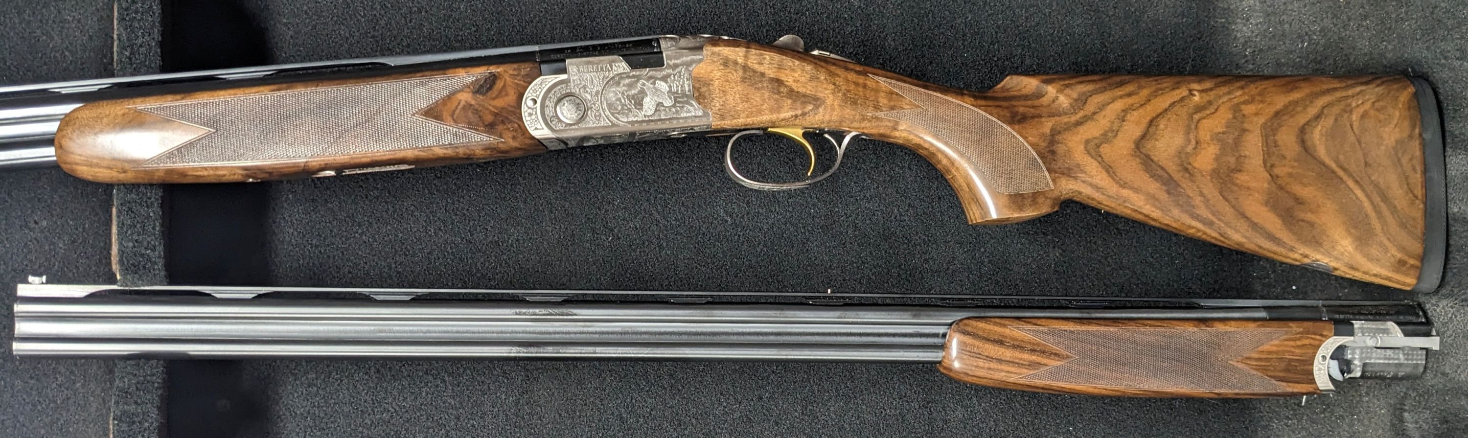 Silver Pigeon 3 Signature Deluxe Sporting Combo - 28 & 410 gauge with 30" barrels, Deluxe engraving, manual safety, upgraded EELL wood, comes in Beretta case with 5 flush Optima HP choke tubes for the 28ga and 5 flush Mobil chokes for the 410.