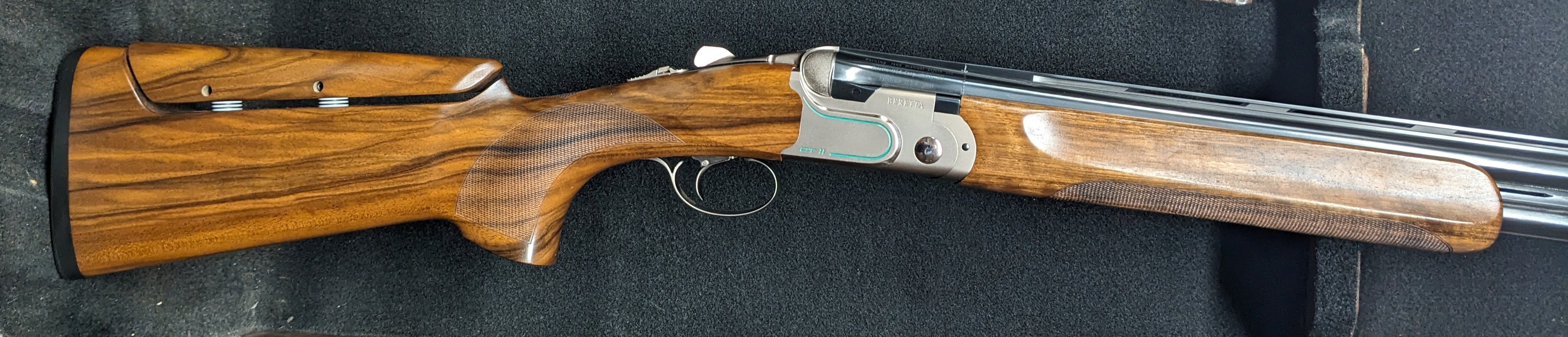 Beretta DT-11 SuperSport - 12 gauge, 31" Steelium Pro barrels with factory extended forcing cones and tram line rib, Special edition version with green lines and lettering on the receiver, updated ergonomics with slightly thinner stock and narrow elongated beavertail forearm, special 1 of 500 engraving under the top tang, comes in compact green Negrini sporting case, includes 6 extended ported choke tubes