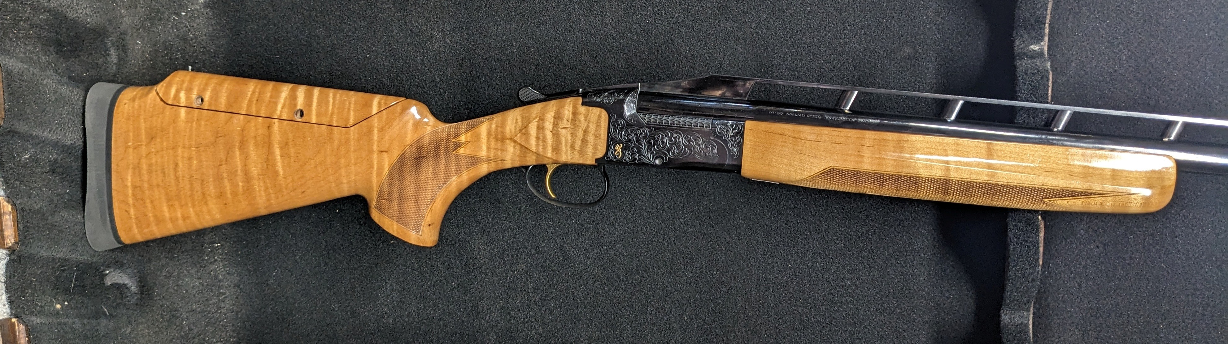 Browning BT-99 Plus Maple - 12 gauge 34" ported barrel with higher rib, Monte Carlo stock with factory adjustable comb and Shot Show special Maple woodset. Scroll engraving on blued receiver, with ejector