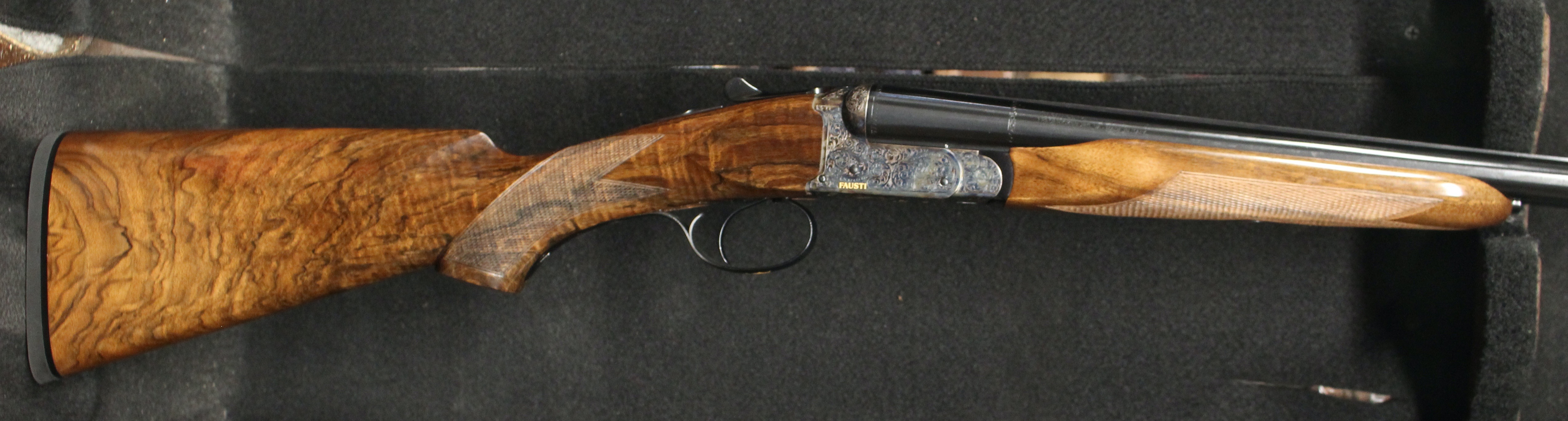 Fausti DEA side by side - 20 gauge with 30" barrels, case colored receiver with scroll engraving, pistol grip stock and Beavertail fore arm, comes in plastic case with choke tubes.