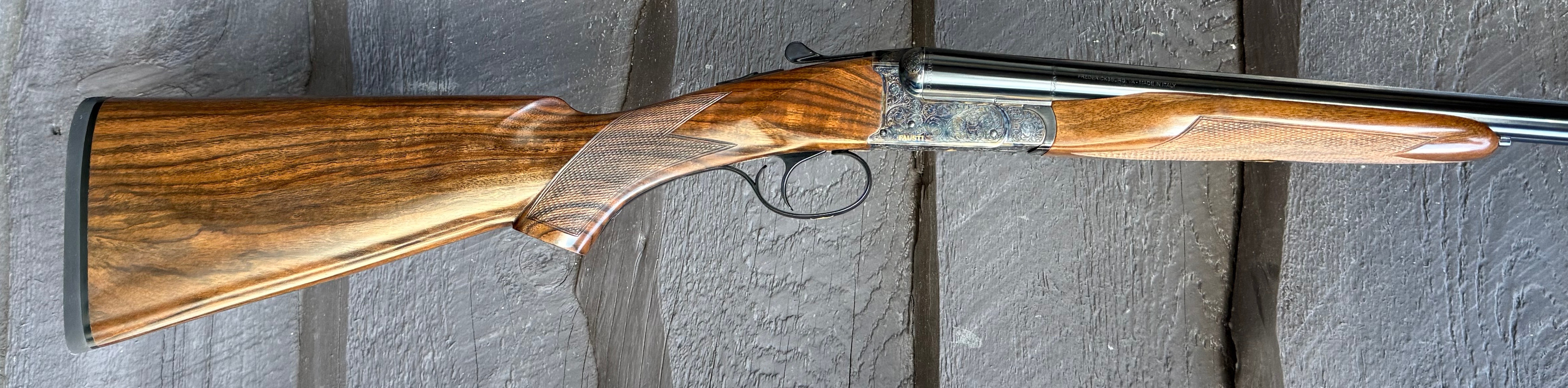 Fausti DEA side by side - 20 gauge with 30" barrels, case colored receiver with scroll engraving, pistol grip stock and Beavertail fore arm, comes in plastic case with choke tubes.