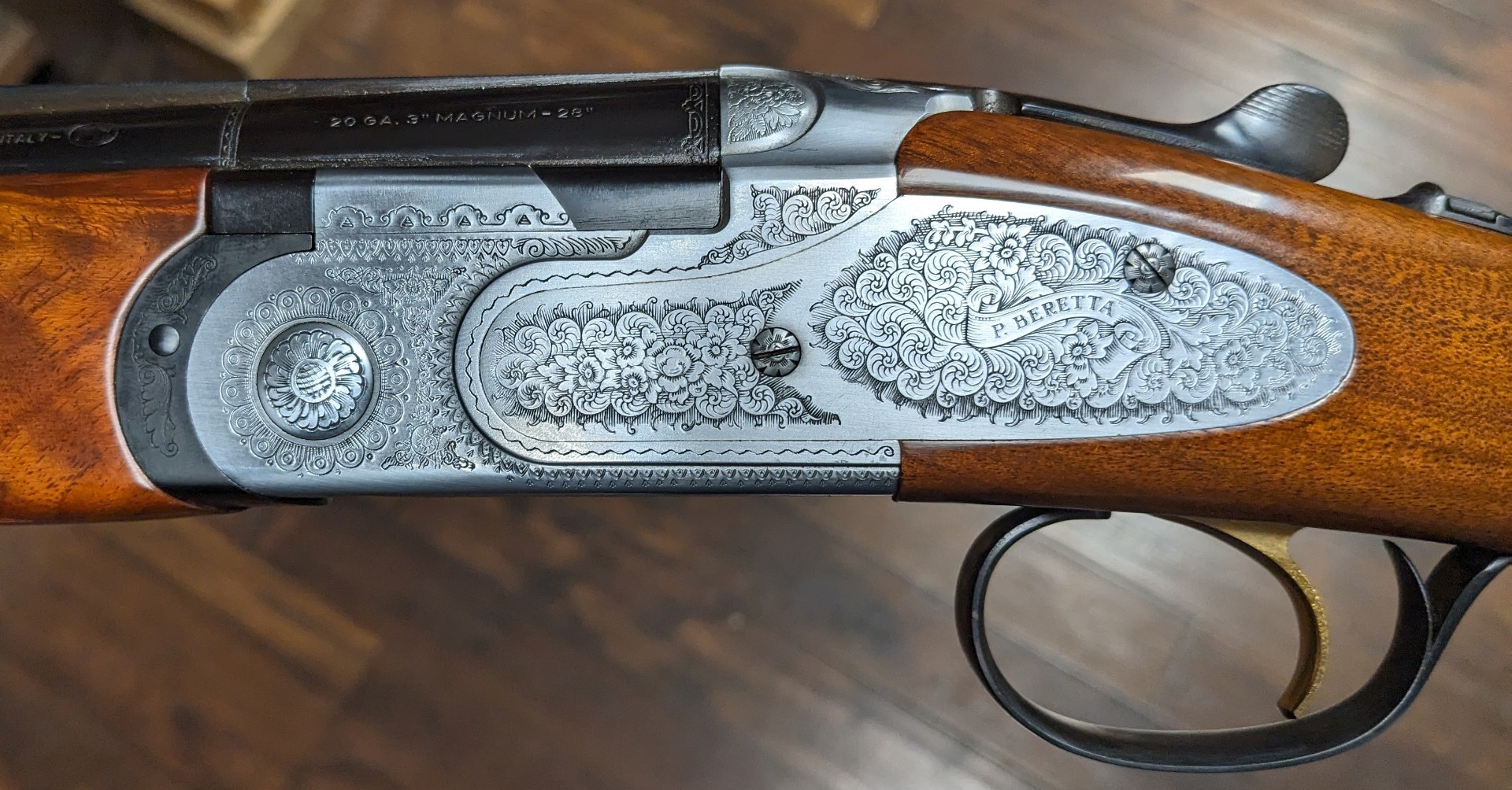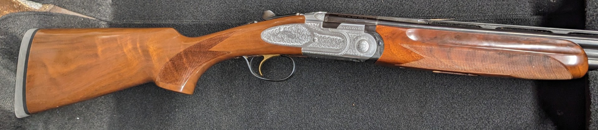 Beretta model 686 EL Field - 20 gauge with 28" mobil choke barrels, stock was cut down to 13 1/4" LOP with decelerator pad, but gun is in unfired condition and does not appear to have been used. full false sideplates with full scroll engraving coverage, comes with 5 flush choke tubes.