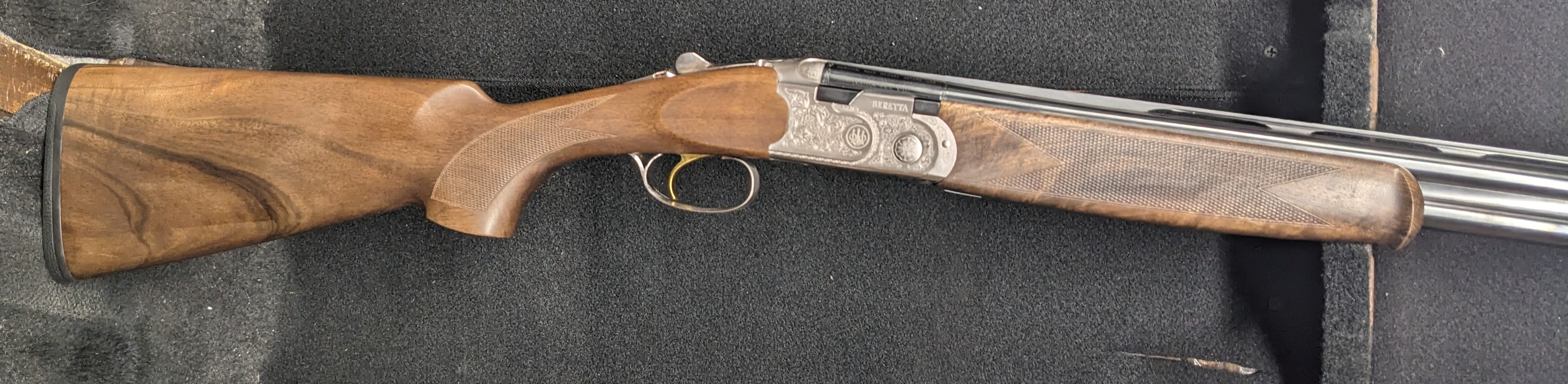 The gun features a gold-coloured single selective trigger. The selector is located on top of the safety tang, allowing the user to select the barrel for the first shot with a simple, rapid sideways movement.