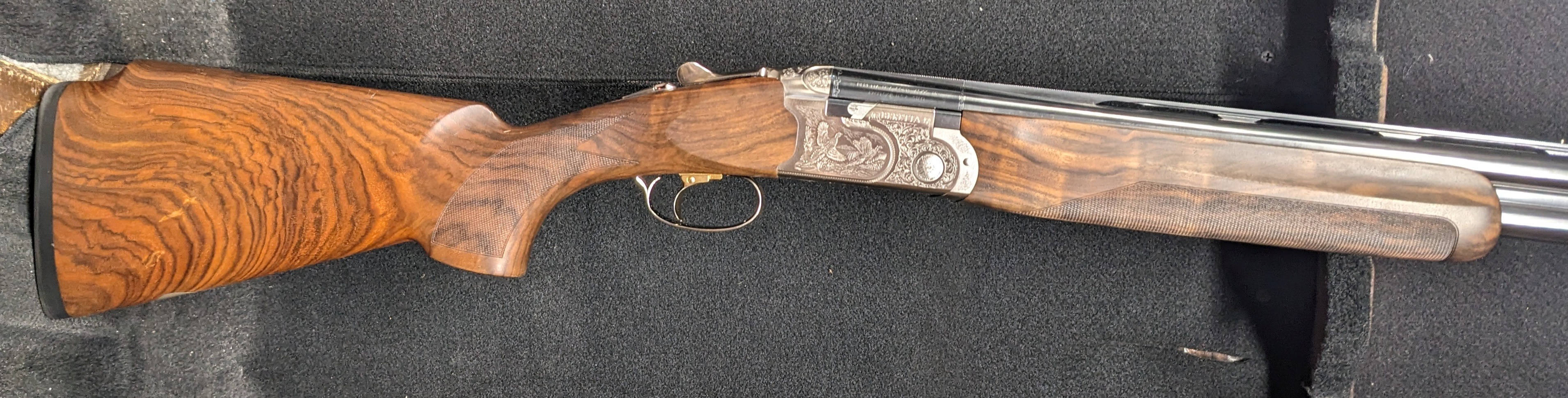 Beretta JEG SIgnature Series Silver Pigeon III All Around - 12 gauge with 30" flat rib sporting barrels, low monte carlo parallel comb on upgraded EELL wood, gun had minor bulge under the choke but was fixed by Briley, otherwise in very good condition, comes in a canvas/leather trunk case with extended Optima Choke tubes