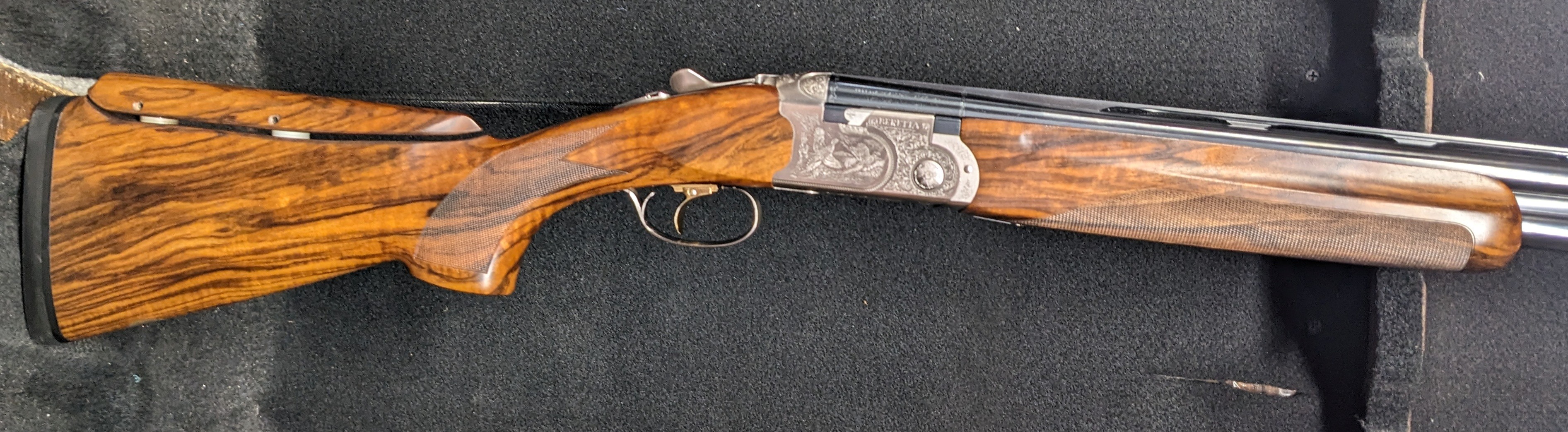 JEG Beretta 687 Signature Series Silver Pigeon III All Around - 12 gauge with 30" optima bore barrels, upgraded EELL wood, low monte carlo stock with added adjustable comb, 14 1/4" Length of pull with pachmeyer pad, Barrels have been ported by Eyester and has 2 custom FITASC choke tubes with it as well as 6 factory optima extended chokes, excellent condition, just some light handling marks, come with metal travel case and cover.