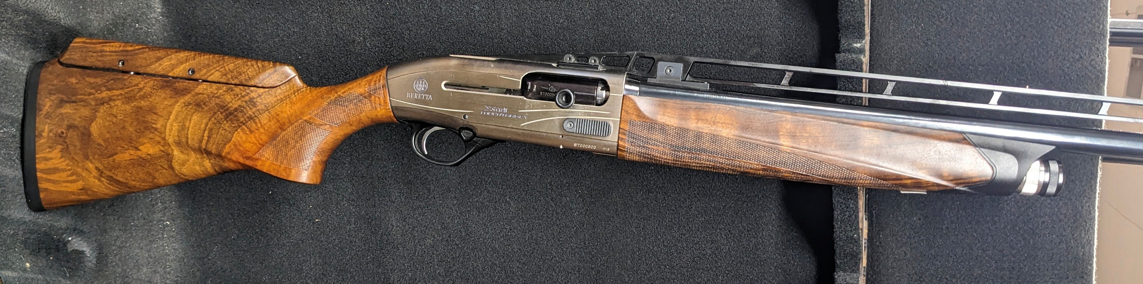 Beretta A400 Xcel Multitarget - 12 gauge, 30" optima HP barrel, factory adjustable rib, factory adjustable comb, very nice piece of walnut, NON kickoff stock, comes in the factory case with 3 extended Optima HP choke tubes, gun is in good condition, just a few little handling marks on the wood, and some tiny scratches right at the muzzle end of the barrel.
